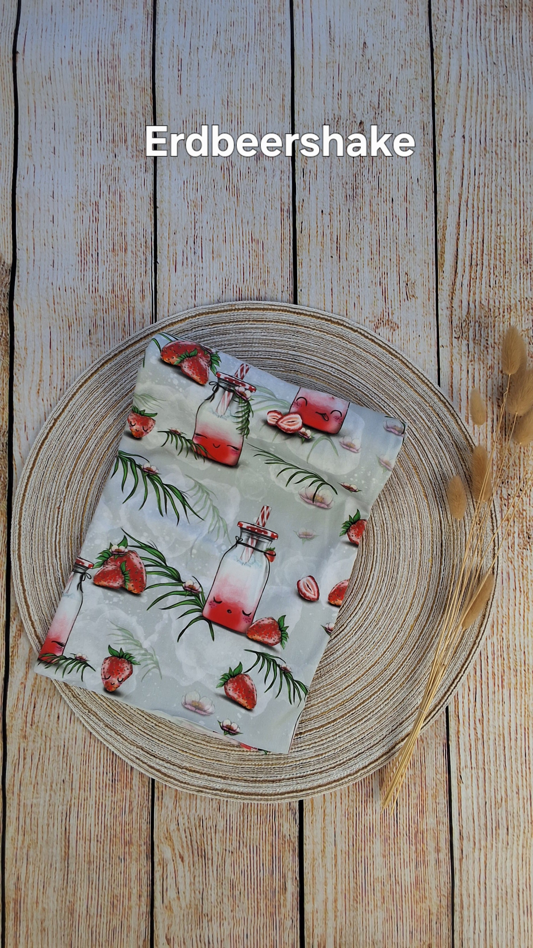 Du erhältst hier 50 cm x VB Baumwolljersey (GOTS-zertifiziert) mit dem Design Erdbeershake.