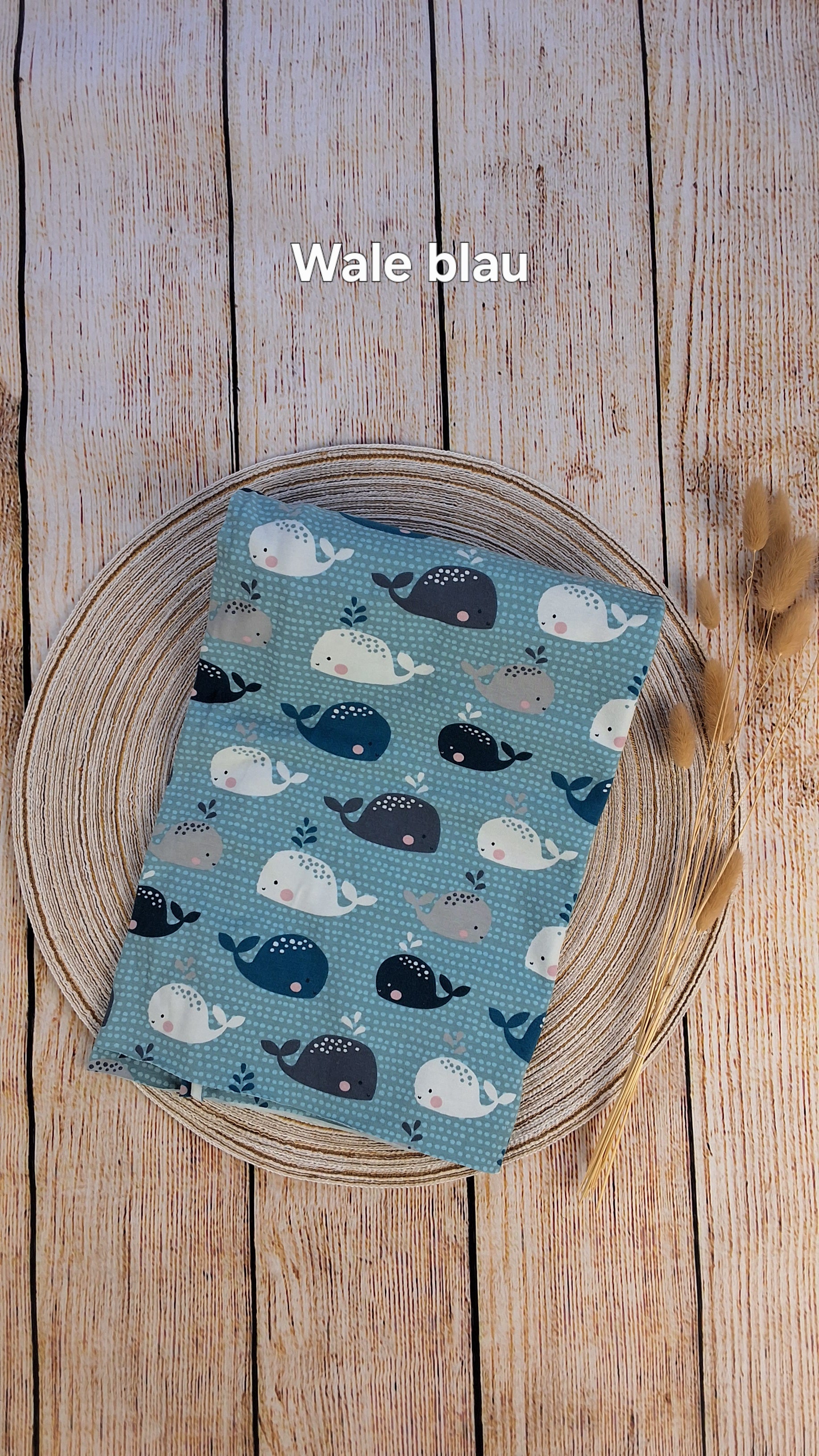Du erhältst hier 50 cm x VB Baumwolljersey (GOTS-zertifiziert) mit dem Design Wale blau.