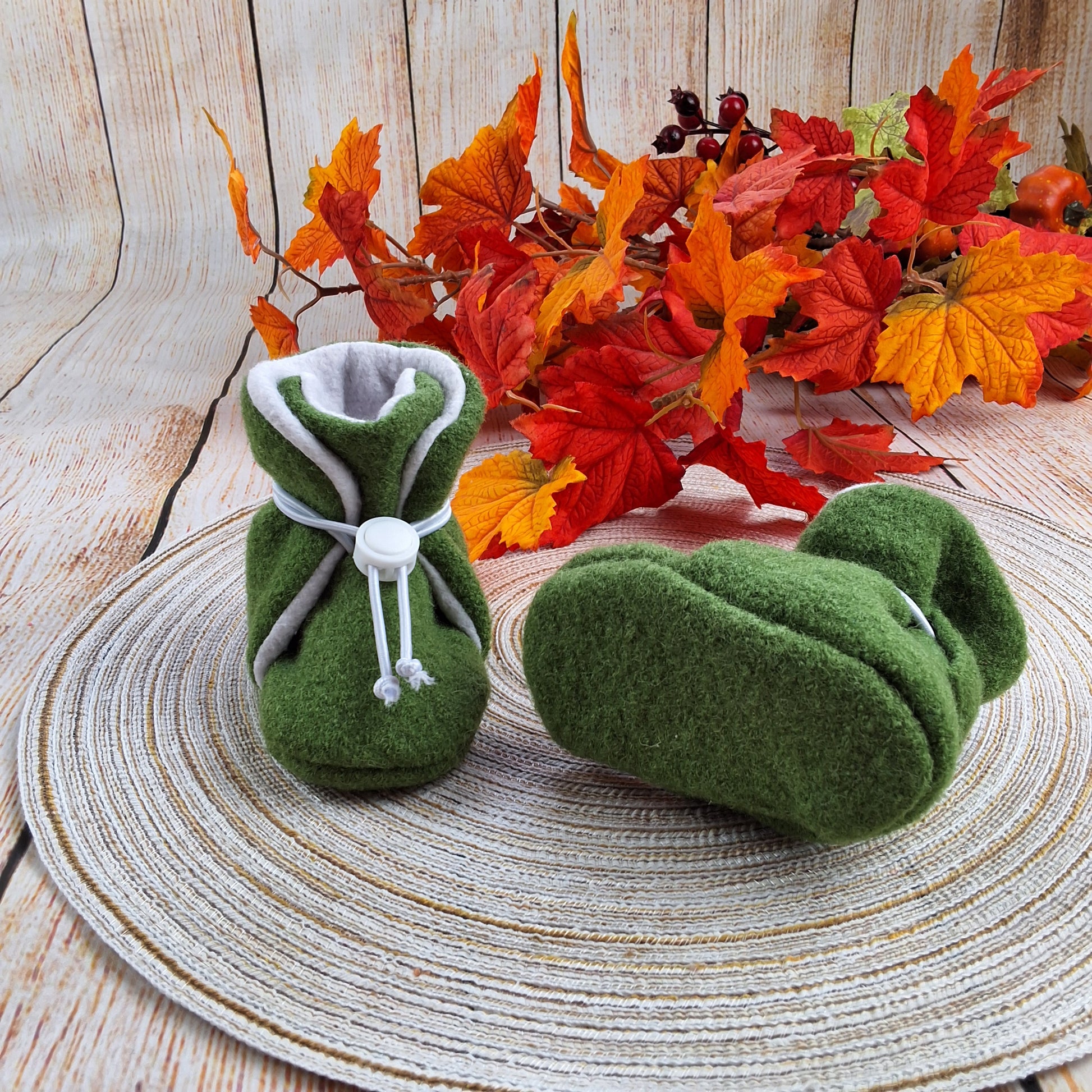 Meine Walk-Baby-Boots werden außen aus hochwertigem Wollwalk aus 100 % Schurwolle gefertigt und sind innen mit einem kuscheligen Fleece aus 100 % Bio-Baumwolle gefüttert.